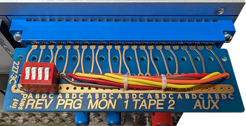 Finally I made another IO board but he wanted the DIP switch for the reverb returns. You can spread the pins to fit the pads in the rear, and fold the pins to wire together over to the reverb return send. I mounted it using Alien Tape which provides insulation for the pins.