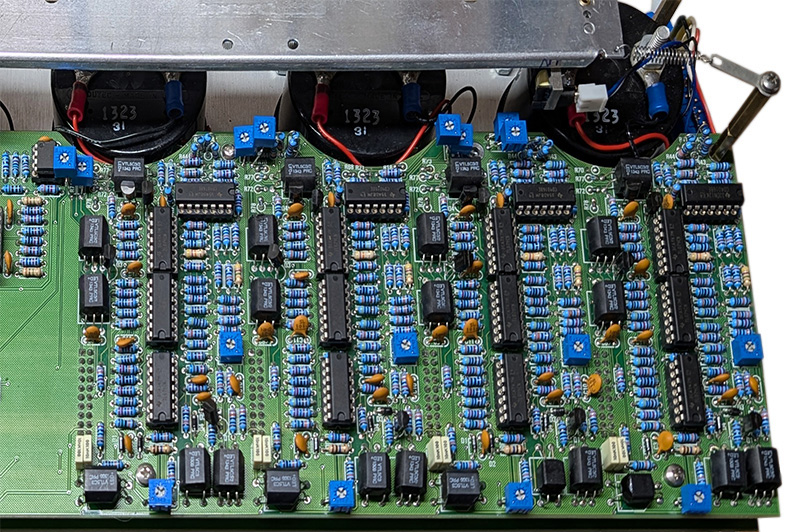 There are 17 trimmers on this PCB consisting of a single MTS level trimmer and four groups of four trimmers: assign, meters, program bus signals, and monitor bus signals.
