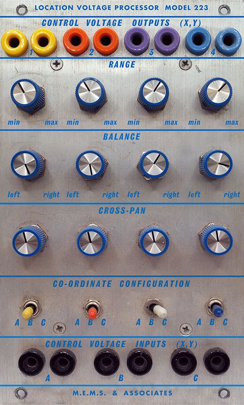 The 223 Location Voltage Processor is intended to be used with the 227 System Interface Module in a quad setup. It contains four separate voltage controlled processors that output an X and a Y voltage for the 227 assign inputs.