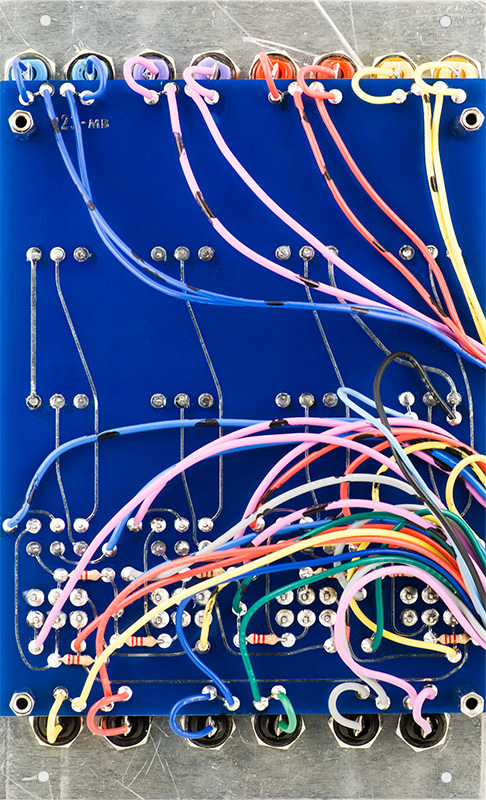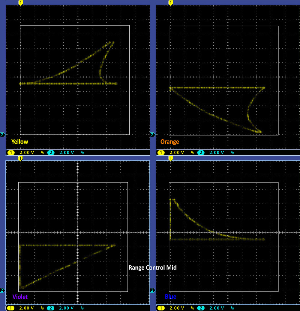 With the Range controls at minimum position, the yellow outputs control the lower right voltage space and the blue outputs controls the lower left voltage space. The orange and violet outputs are limited to lower left to right voltage control.