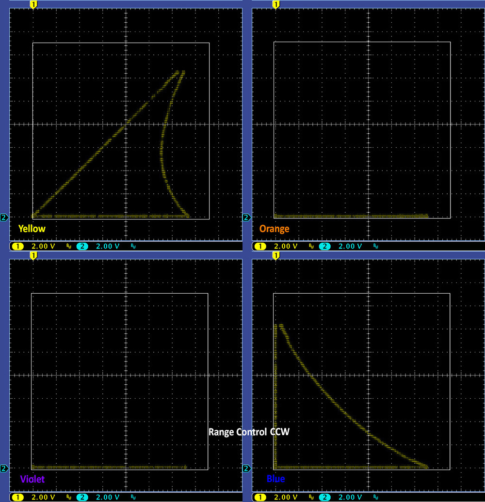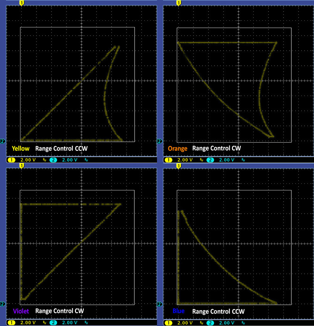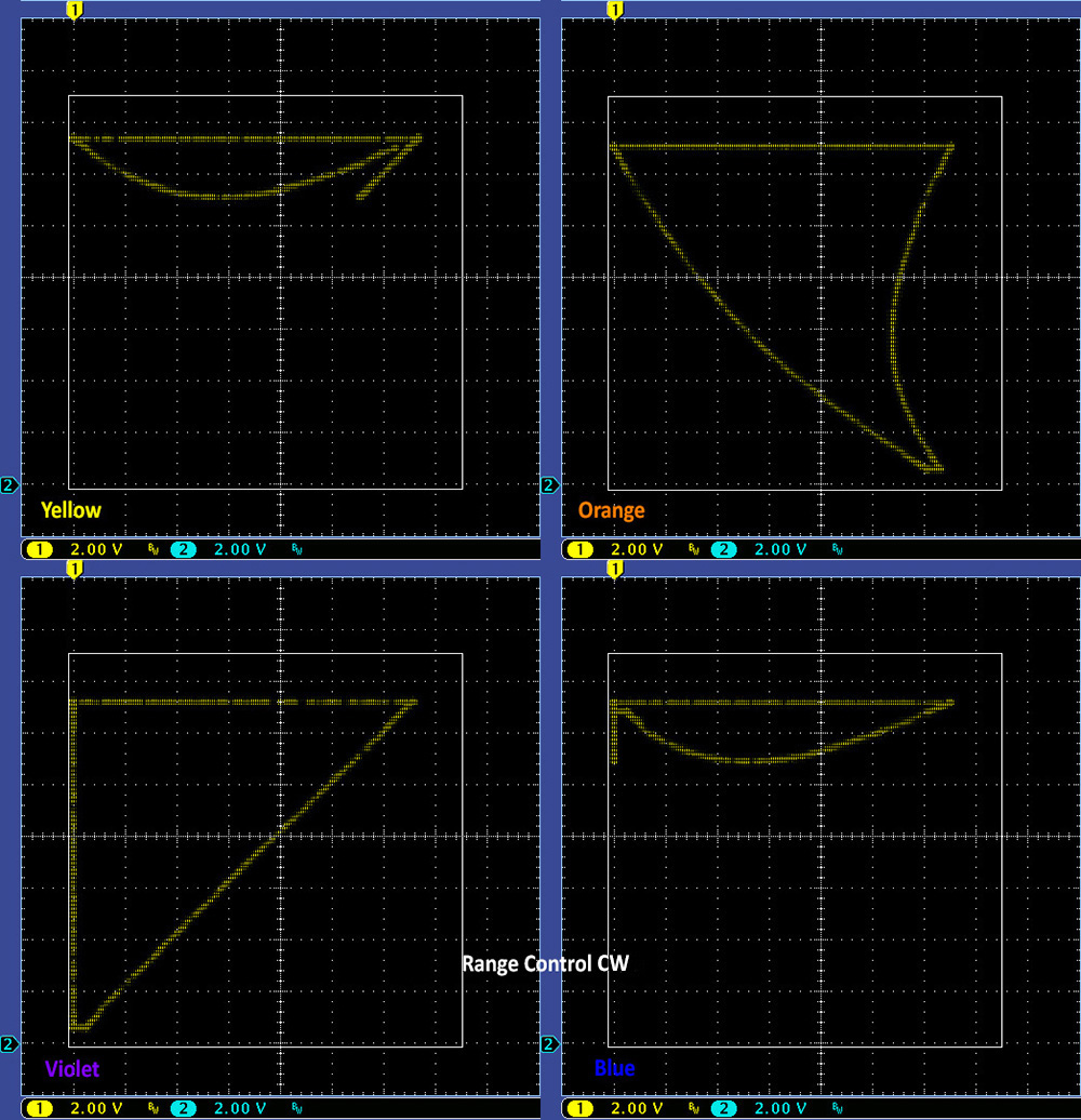 Another way of looking at this is to have full control of the space, the yellow and blue channels should have the Range controls at CCW and the orange and violet channels should have the Range controls at CW. This way yellow controls the lower right, orange controls the upper right, violet controls the upper left, and blue controls the lower left voltage spaces.