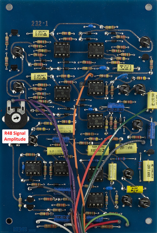 The signal amplitude R48 notes in the schematic has different descriptions. (1) adjust for maximum signal level at the gray wire (C8+) at 1 KHz input, and (2) adjust for maximum signal at the output of IC2 (pin 6). This is the output of the signal leveler so adjustment should be made for maximum signal level over the input signal frequency range. I just set it to maximum.