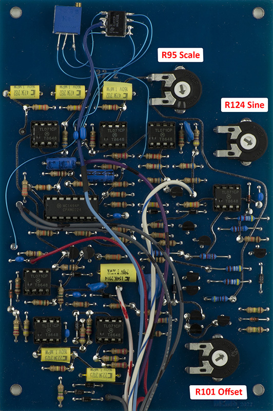 I did not keep calibration instructions when I worked on this module and likely calibrated a bit by trial and error. From above - I was able to adjust this module to operate over the specified range of 80 Hz to 2500 Hz. I first tried scaling with the MC1494 removed and was able to get the locked oscillator to track over a fairly wide range. However, when the MC1494 was inserted it wouldn't lock so I adjusted the level trimmer on PCB1 to maximum and then adjusted the scale and offset trimmers until it tracked.