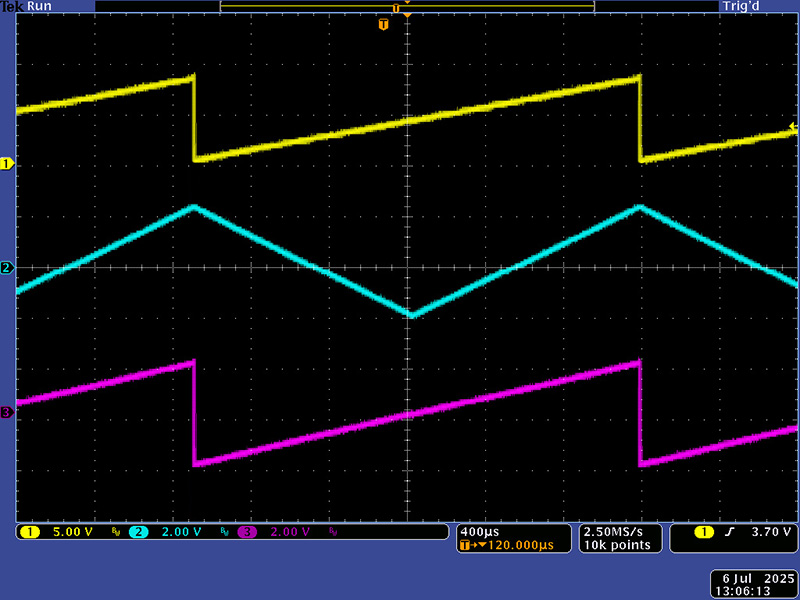 The resultant output levels are ~9.5V for the unipolar CV, and +/-2V for the triangle and output.