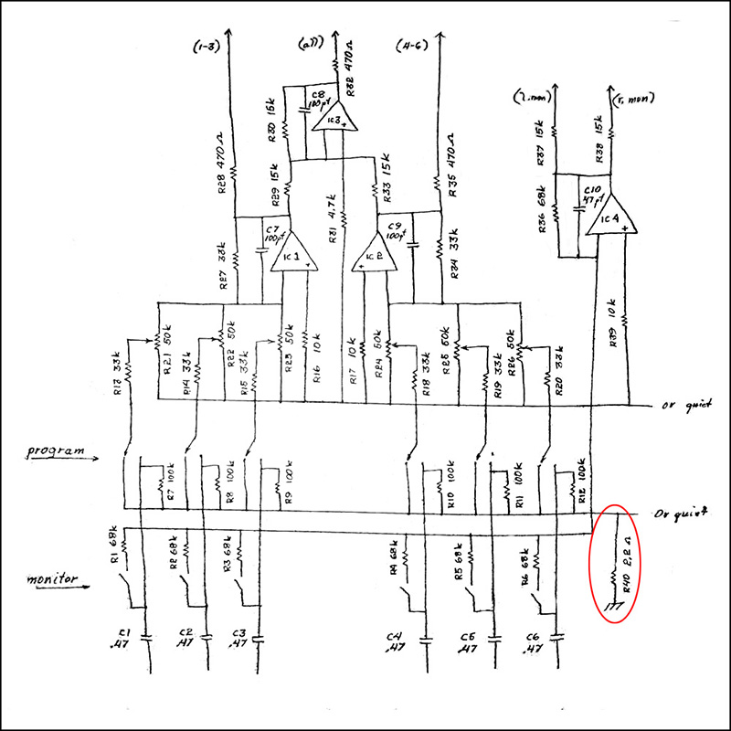 MEMS sent me this photo of the rear of a vintage 206 Dual Mixer. You can clearly see the part in question is a 2.2 µH inductor, not a resistor. This makes more sense and would not cause the bleed issues. I assume Don just carried this schematic error through other similar modules.