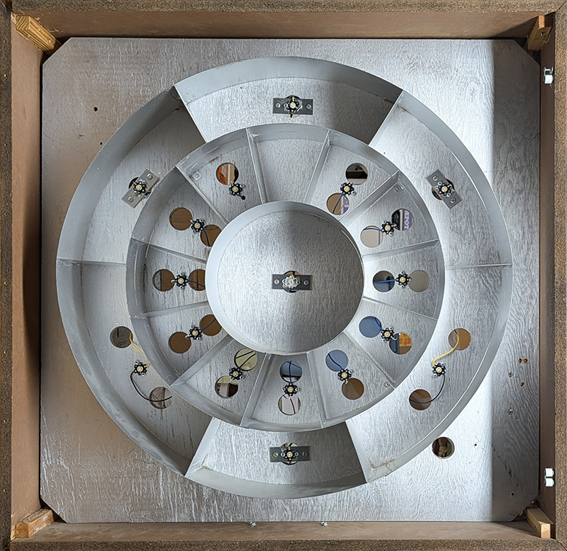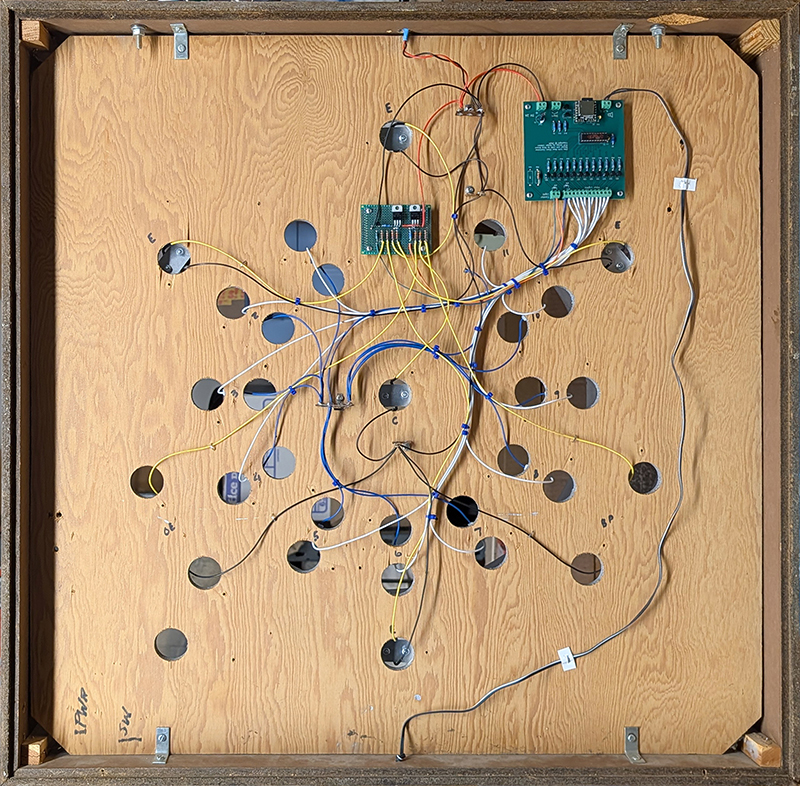 This clock runs on a switched outlet so there was no need for the switch input. This also saves wear on the power supply as it is not powered on continuously. On power up, 3 LEDs illuminate the center and the B.P. and O.E. sections, and the hour chime sequence begins. When the sequence reaches the ending chimes sequence, 4 additional LEDs light the bottom and top outer ring areas. All LEDs stay lit for 30 seconds and then turn off. The clock requires a power cycle to restart.