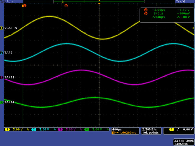 The total delay, Td = [24L x 24C]1/2, calculates to be 945 µS and measures ~948 µS. Each stage contributes ~40 µS of delay so tap6 correlates to ~315 µS of delay and tap11 correlates to ~630 µS of delay.