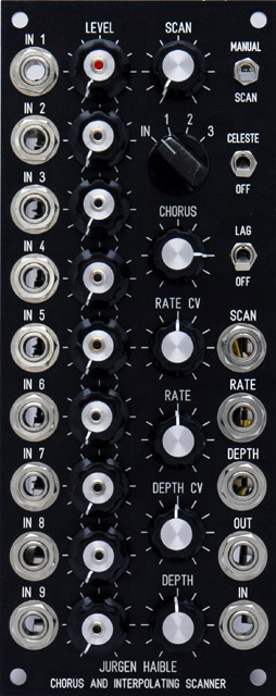 The scanner can be used as a waveshaper by applying a DC level to the 9 inputs and applying the input to the Scan. I have normalled my inputs to +5 volts so with no input I can set the DC level from 0 to +5 volts. For -5 volts I need to connect the inputs to a bias generator.