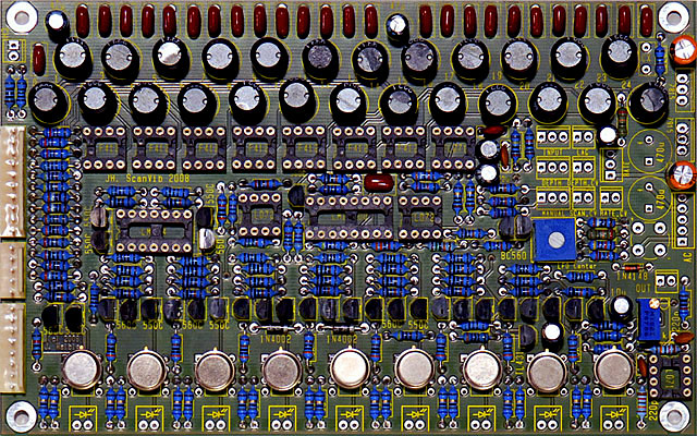 Here is the assembled PCB. I used NOS LM394 transistor pairs (across the bottom). I've since added MTA connectors for the LEDs.