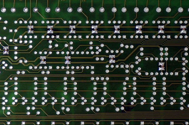 This is a close-up of the back of the PCB showing 14 of the 17 soldered SMT capacitors.