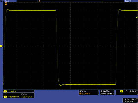 The new -200 firmware provides good resolution up to the maximum 0.5 µS horizontal scale. Below are the images of a 300 KHz square wave using a 1X probe daisy chained through to my 1GHz Tektronix scope.