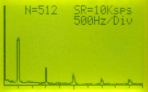 This image shows FFT mode of a 500 Hz square wave at 500 Hz/division. You can see the fundamental at the first division and the odd harmonics at diminishing amplitude at the 3rd, 5th, 7th, and 9th division.
