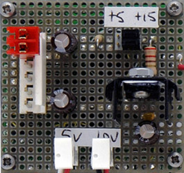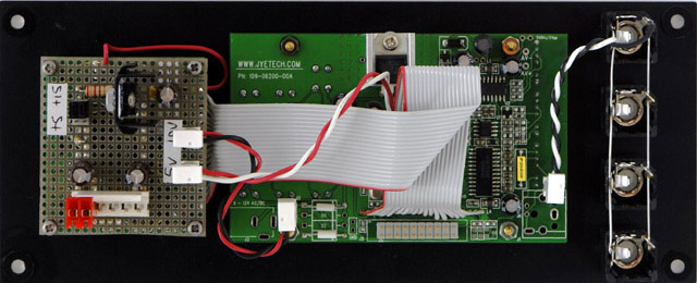 The LCD oscilloscope is designed for 9 to 12 volts AC. I eliminated the rectifier diodes and added a 0.1" MTA connector for 10 volt DC power. I designed an auxiliary PCB to mount on the rear of the LCD to regulate +15 volts to +10 volts. Using a 10 volt regulator splits the heat dissipation with the +5 volt regulator on the LCD oscilloscope.