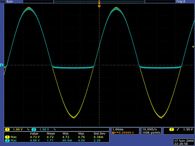 The input signal (yellow) is limited to -0.3 to +5 volts for the frequency circuitry.