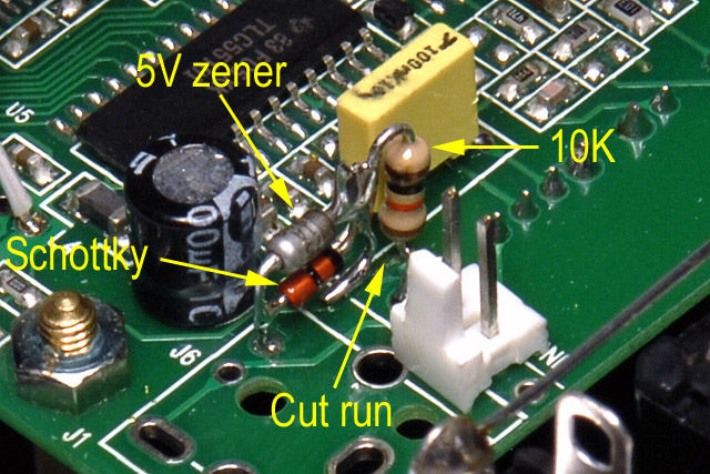 The frequency input is limited to 0 to 5 volts. I cut the frequency run on the PCB after the switch and added a 10K series resistor with a schottky diode to limit the negative voltage and a 5V zener diode to limit the positive voltage (I chose using a zener so I would only require connections to a ground pad). Alternatively you could limit the positive voltage with a schottky diode to +5 volts. If you don't want to cut a run, you can use R25 to limit the current and add the diodes after it.