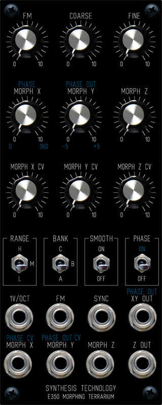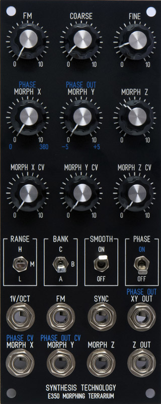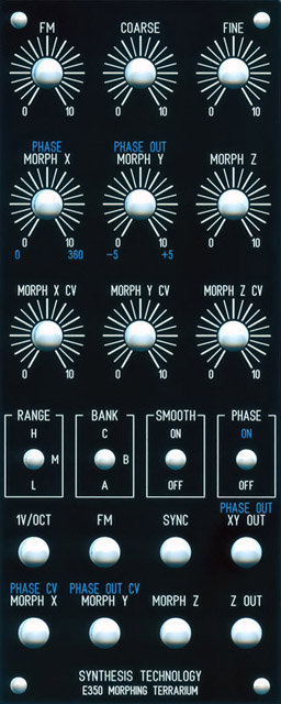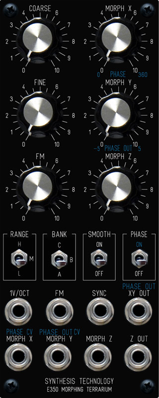 I built the Synthesis Technology E350 Morphing Terrarium kit as discussed in the E350 Morphing Terrarium and the E340/E350 DIY kits forums. This is a 5U format module with additional CV attenuators and all controls, switches, and jacks mounted on the front panel. I also added front panel Smooth (interpolation on/off) and Phase mode switches.