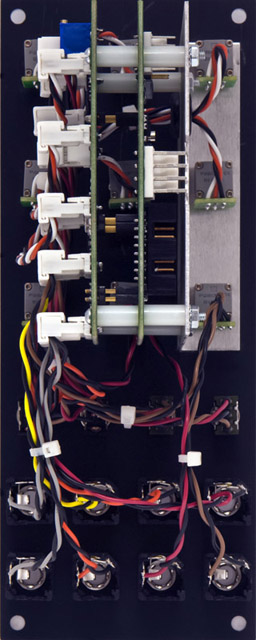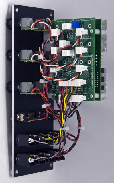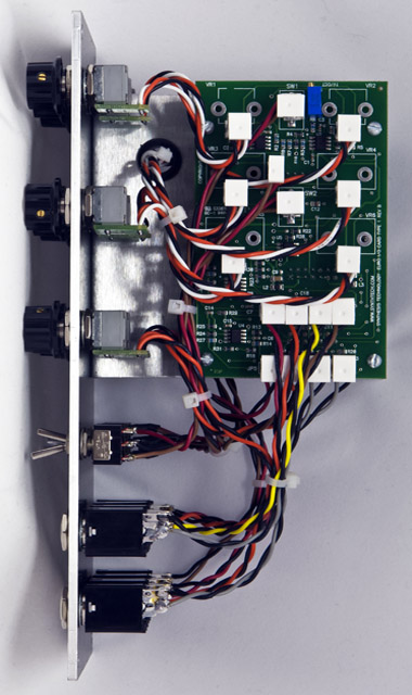 There are a lot of front panel wires on this module. Using a separate 3 pin MTA connector for each control, jack, and switch simplifies the wiring task.