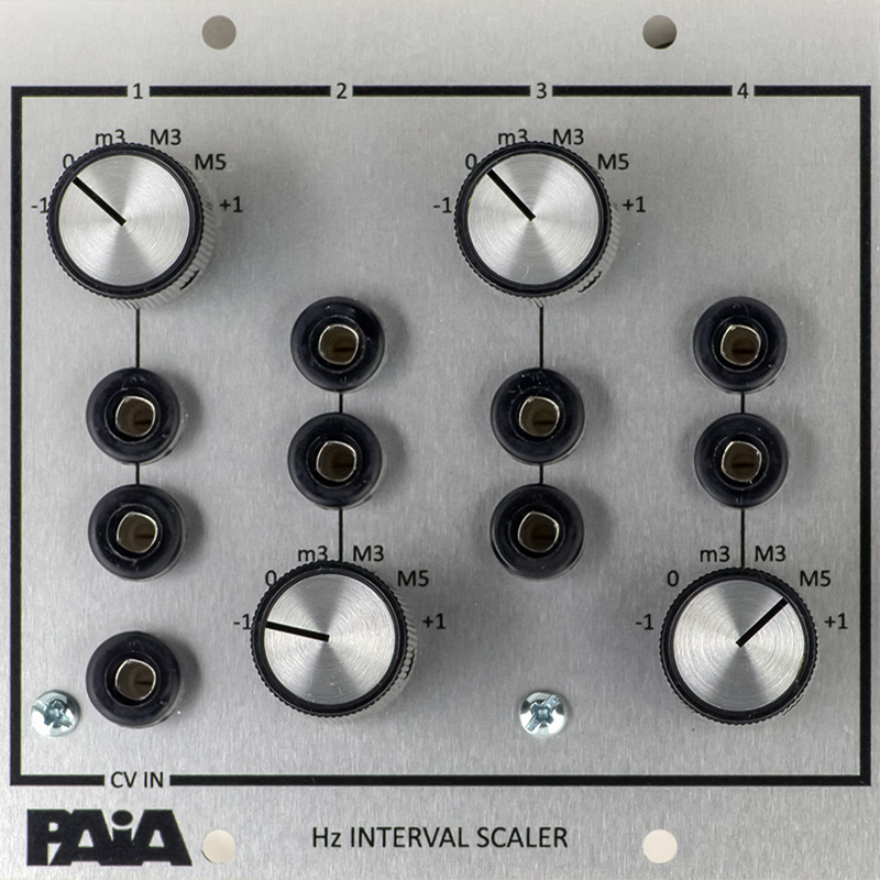 I made the panel using 1.5mm anodized aluminum with the print graphics feature from FrontPanelExpress. There is a single CV input which is scaled to 6 different intervals: -1 octave, no scaling, minor 3rd, major 3rd, major 5th +1 octave. There are four separate channels, each with two paralleled outputs.