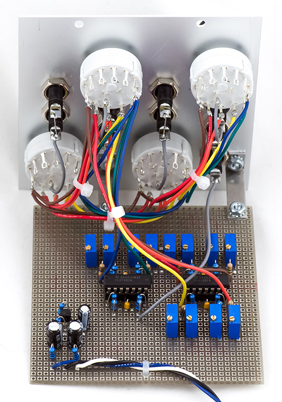 The PCB is hand wired and uses +18 and -9V. The +18V supply is required to reach an 8 volt CV output. Each scaler has a gain trimmer and offset trimmer. To minimize dependence on the power supplies, a +/-5V reference supply is generated for the trimmers.