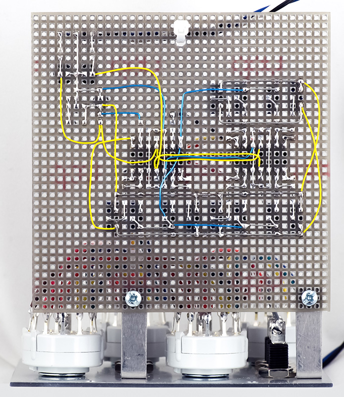 I was able choose a layout that minimized hand wiring of sections. Yellow is the power supply wiring and blue is the signal wiring.
